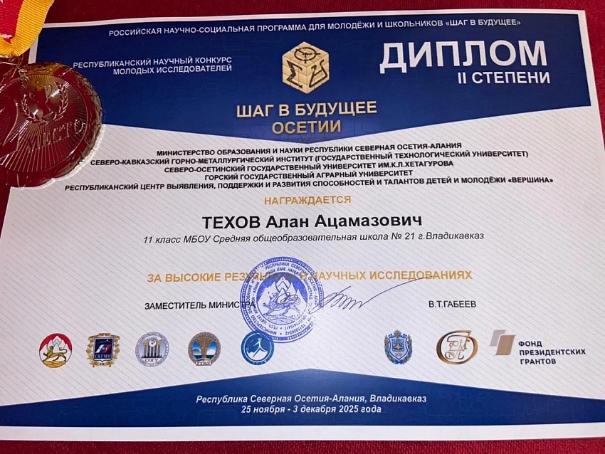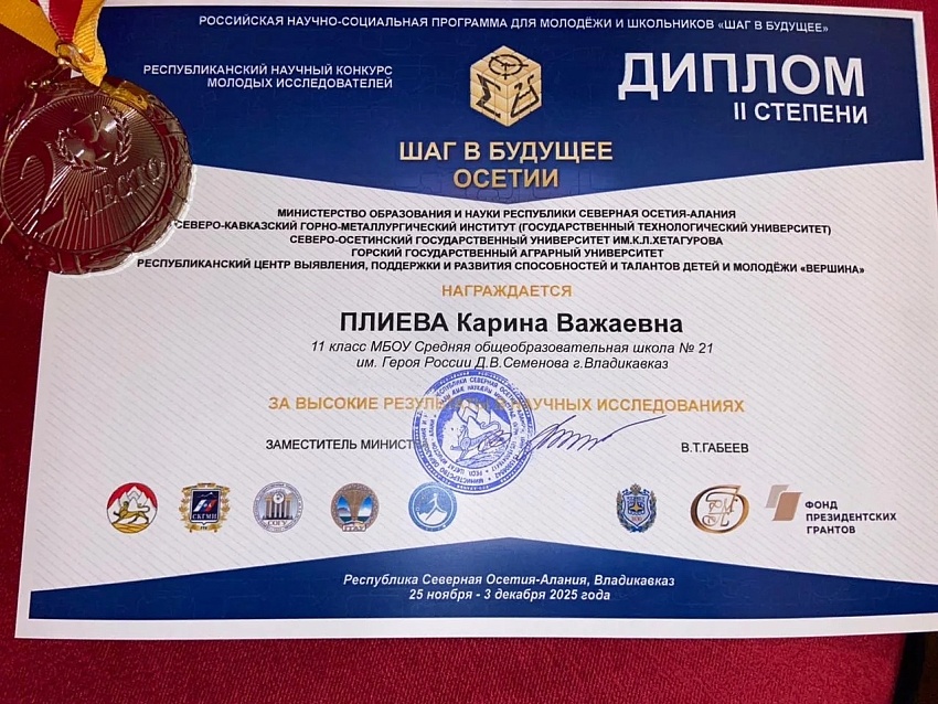 Во Владикавказе с 25 ноября по 3 декабря 2025 года проходил XXVII республиканский научный конкурс молодых исследователей «Шаг в будущее Осетии». Конкурс проводится уже 27 год с целью формирования ключевых компетенций профессионально-значимых личностных качеств и мотивации к практическому применению знаний, создания необходимых условий для поддержки одаренных детей.