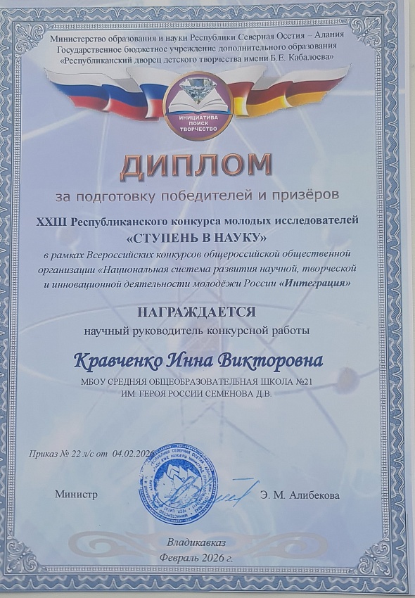 А так же учителей, его научных руководителей: Кравченко Инну Викторовну и Джериеву Фатиму Муратовну.